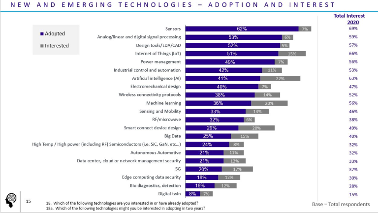 我们在调查中也询问了工程师们已经采用哪些新技术(参考下图统计条的蓝色部分)?还有他们在两年内有兴趣采用的新技术(参考下图统计条的灰色部分);其中传感器受关注程度最高,这或许也是让讯号处理技术排名第二的主要原因。